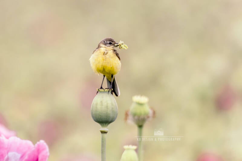 Jonge gele kwikstaart op een bol van een uitgebloeide klaproos (papaver).